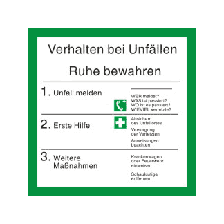 Rettungszeichen weisen auf Einrichtungen, Geräte oder Rettungswege hin, die für Rettungsaktionen von Bedeutung sind. Sie haben eine grüne Grundfärbung, einen weißen Rand und ein weißes Piktogramm.
