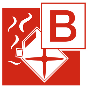 Brandklasse B steht für Brände flüssiger und flüssig werdender Stoffe. Darunter u.a. Alkohol, Äther, Benzin, Fette, Harz, Kunststoff, Lacke, Paraffin, Wachs. | |